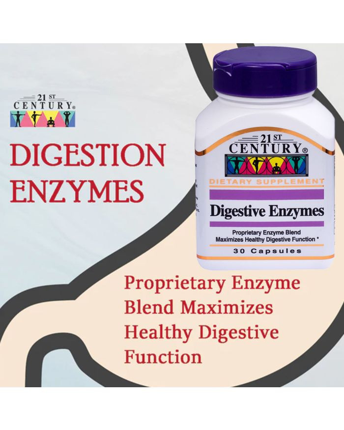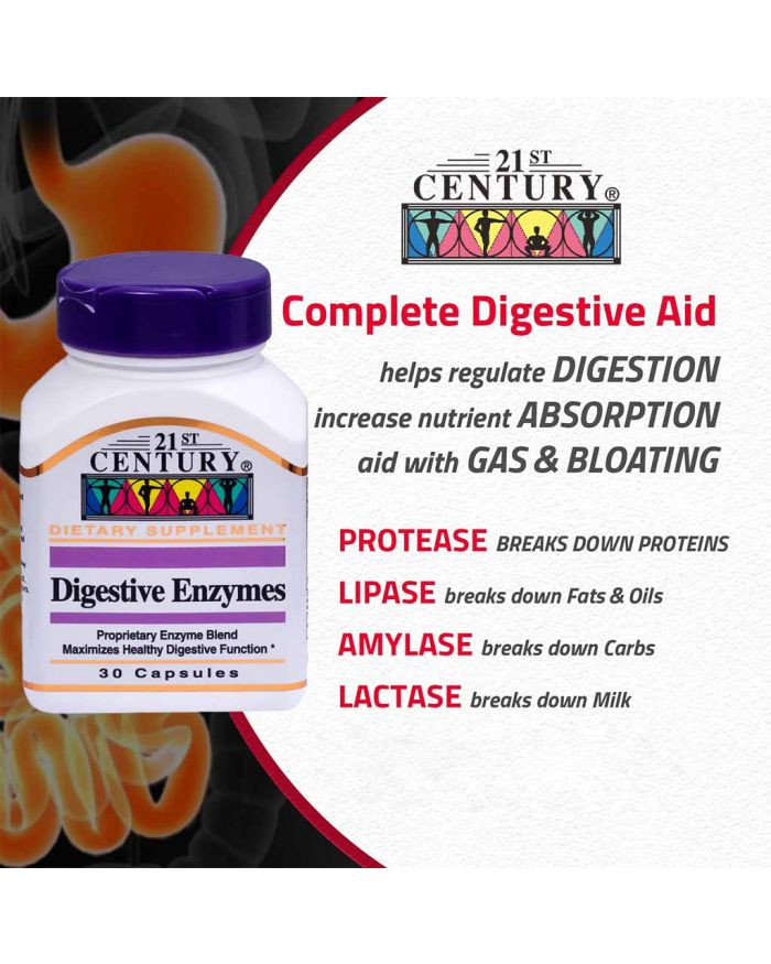 21st Century Digestive Enzymes is a proprietary digestive enzyme blend formulated to maximize healthy digestive function. This proprietary digestive enzyme blend assists the body in breaking down and absorbing nutrients to produce energy and enhance your overall health. 21st Century Digestive Enzymes is a unique, proprietary blend of five specific enzymes, viz. amylase (starch digestive enzyme), protease (protein digestive enzyme), lipase (Fat digestive enzyme), cellulase (cellulose hydrolyzing enzyme), lactase (lactose hydrolyzing enzyme) and maltase (maltose hydrolyzing enzyme). Amylase breaks down carbs in starchy foods like bread, potatoes, or beans into simple sugars. Lactase breaks down lactose, the sugar in milk. Protease breaks down proteins in foods like eggs, meats, or dairy foods into amino acids. Lipase breaks down fats from foods like nuts, oils, or butter into fatty acids. This blend provides optimal digestion of all the macromolecules. 21st Century Digestive Enzymes are intended to support optimal digestion of proteins, fats, carbohydrates, fiber, and complex sugars, in doing so, reduce digestive symptoms like gas, bloating, discomfort etc. The formula also might help you absorb more nutrients from the foods you eat.