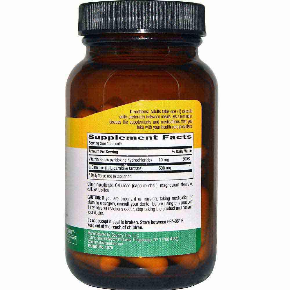 L-Carnitine supports energy production and the metabolism of fat. Country Life uses vitamin B6 to aid in utilization. It increases the production of red blood cells, which transport oxygen throughout body and muscles.