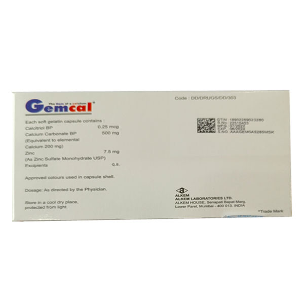 GEMCAL CAPSULE is a combination of Calcitriol, Calcium carbonate and Zinc sulphate which belongs to the group of medicines called Nutritional supplements. It is used in adults for the management of low blood calcium levels in conditions including chronic renal failure, osteodystrophy (bone pain, joint pain, bone deformation and fractures due to kidney disease or disturbances in calcium and phosphorus levels), osteoporosis (bones become weak and brittle as we age).
