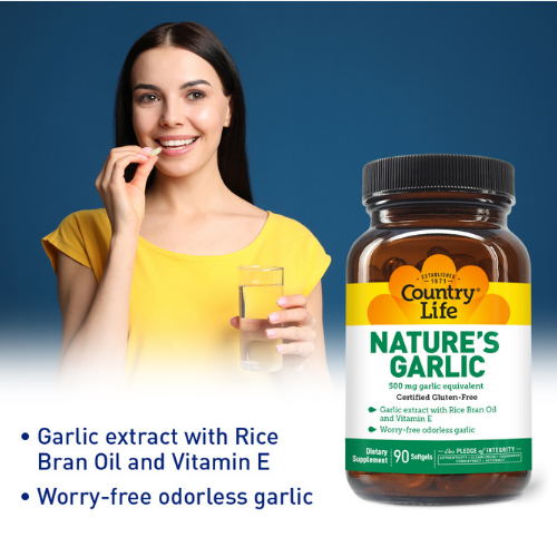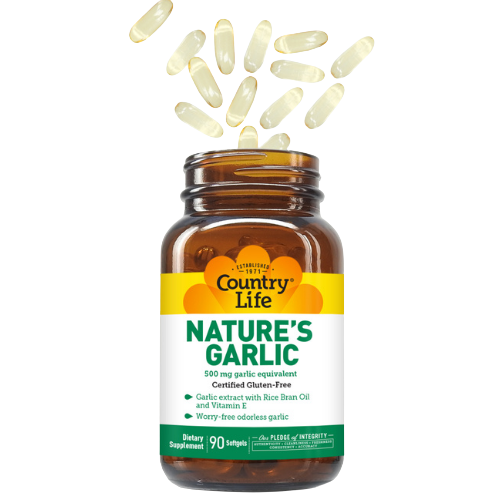 Country Life’s Nature’s Garlic provides 5mg worry-free odorless garlic extract (500 mg garlic equivalent) with Rice Bran Oil and Vitamin E. As with all Country Life products, Nature’s Garlic is certified Gluten-Free.