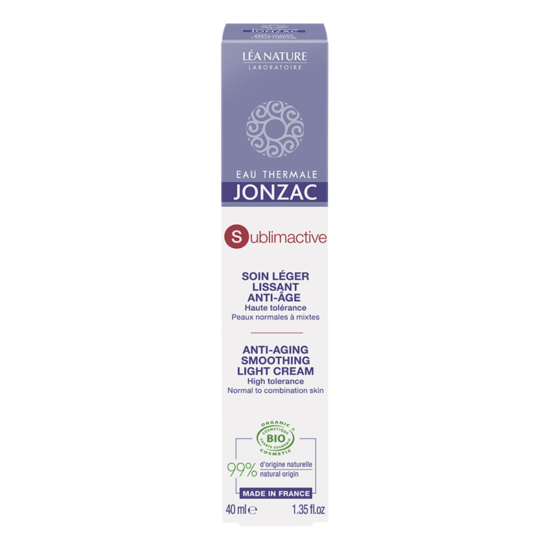 Enriched with anti-aging Jonzac Thermal Spring Water and Dextran Salt, the Sublimactive Smoothing Light Cream with its delicate texture, prevents premature signs of aging and fights the appearance of wrinkles.It hydrates normal to combination skin.