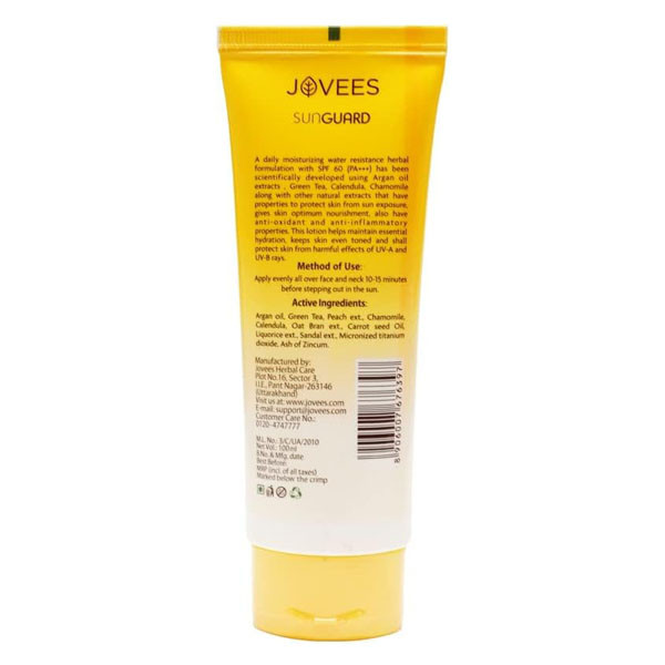 Jovees Argan Sun Guard Lotion SPF 60 PA++++ is an advanced and high-performance sunscreen designed to provide maximum sun protection for your skin. Enriched with the goodness of Argan oil and other natural ingredients, this lotion forms a powerful shield against harmful UVA and UVB rays, preventing sunburn, premature aging, and skin damage. With its non-greasy texture and potent SPF 60 PA++++ rating, it offers long-lasting sun protection for a healthy and radiant complexion.