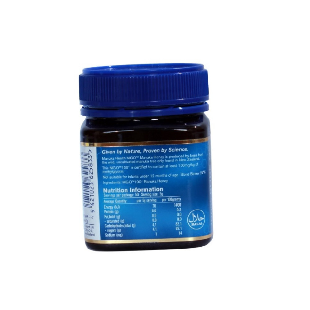 Ingredients: 100% pure Manuka Honey (Leptospermum scoparium) with a minimum Methylglyoxal (MGO) content of 100+ mg/kg.