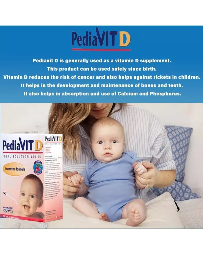 Pediavit D is generally used as a vitamin D supplement. This product can be used safely from birth. Vitamin D reduces the risk of cancer and also helps against rickets in children. It helps in the development and maintenance of bones and teeth. It also helps in absorption and use of Calcium and Phosphorus.