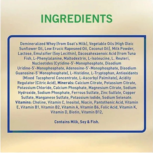 The specific ingredients in S-26 Goat Milk Stage 1 Infant Formula Powder may include goat's milk protein, vegetable oils, lactose, vitamins, and minerals, providing essential nutrients for infant nutrition.