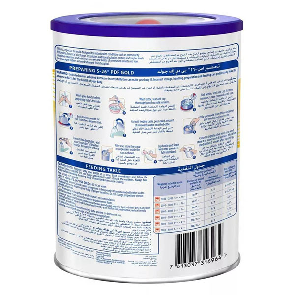 The specific ingredients in S-26 Gold PDF Milk Powder may vary based on the product's formulation. However, it typically contains a blend of proteins (e.g., whey protein, casein), carbohydrates (e.g., lactose, maltodextrin), vegetable oils, vitamins, and minerals necessary for infant nutrition.
